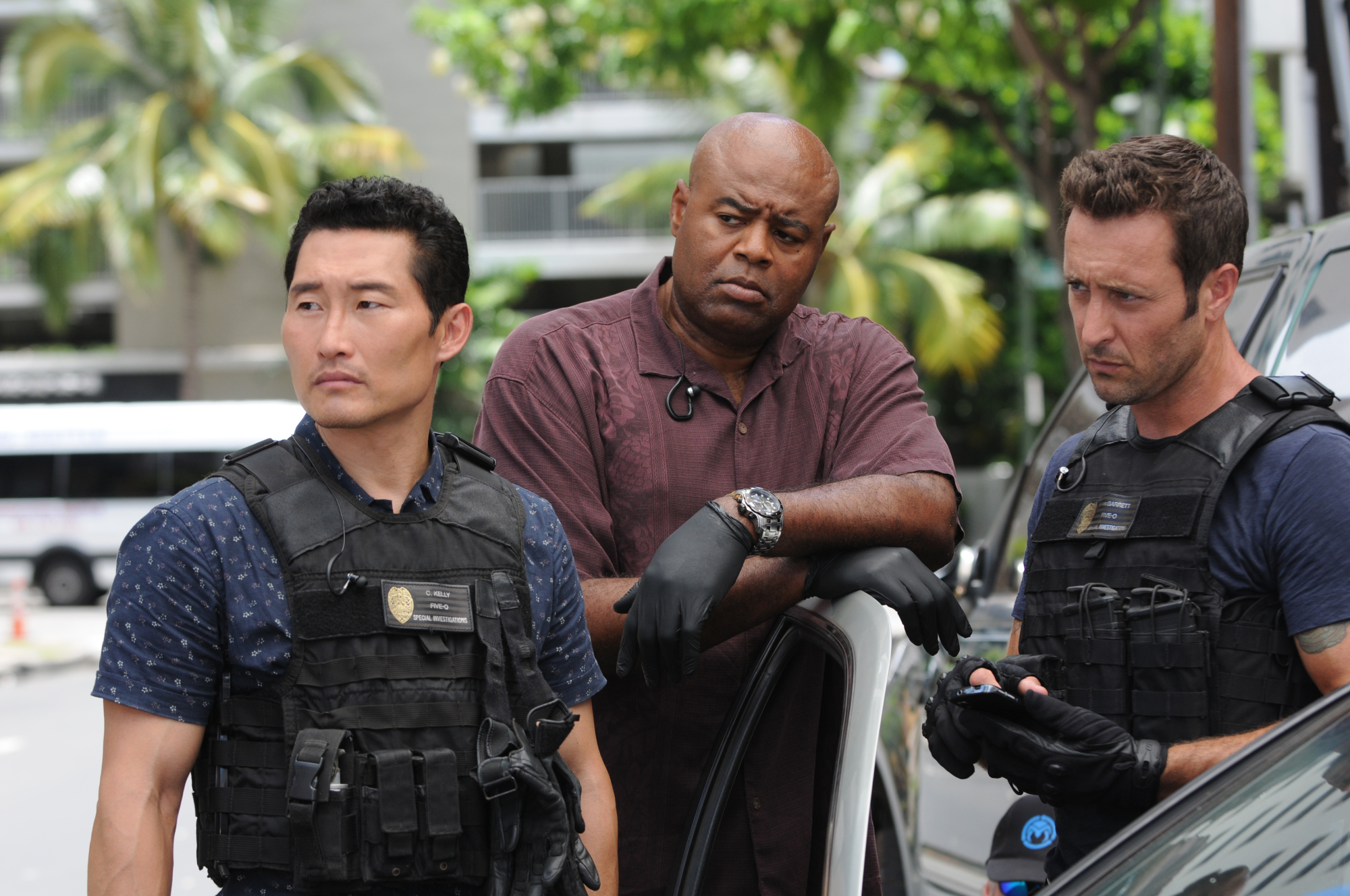 «Ka Papahana Holo Pono» — Five-0 investigates when a wealthy recluse is found dead in a remote field with nearly one million dollars in counterfeit bills. Also, Adam is kidnapped by the Yakuza and forced to torture one of Gabriel’s men, on HAWAII FIVE-0, Friday, Oct. 16 (9:00-10:00 PM, ET/PT), on the CBS Television Network. Football legend Jerry Rice guest stars as himself. (*»Ka Papahana Holo Pono» is Hawaiian for «Best Laid Plans») From left, Chin Ho Kelly (Daniel Dae Kim), Captain Lou Grover (Chi McBride) and Steve McGarrett (Alex O’Loughlin), shown. Photo: Norman Shapiro/CBS é2015 CBS Broadcasting, Inc. All Rights Reserved