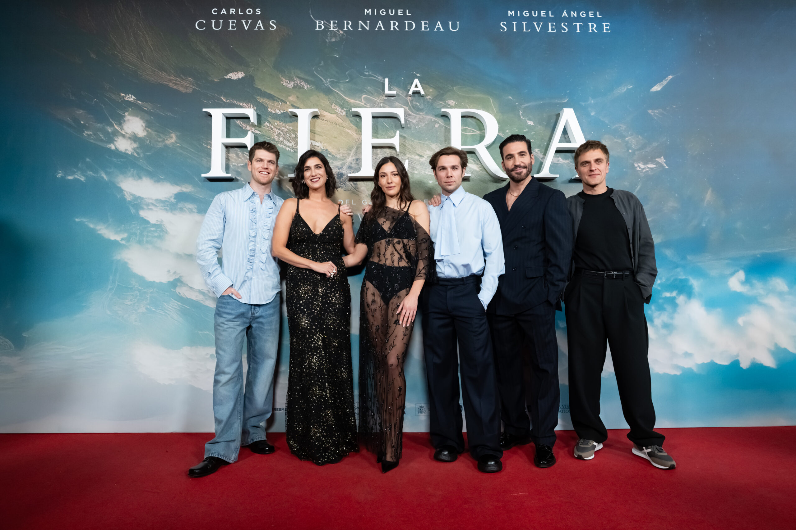 MADRID, SPAIN – FEBRUARY 04: Miguel Bernardeau, Stéphanie Magnin, Candela González, Carlos Cuevas, Miguel Ángel Silvestre and David Marcé attend the premiere of «La Fiera» at Cine Capitol on February 04, 2026 in Madrid, Spain. (Photo by Juan Naharro Gimenez/Getty Images)