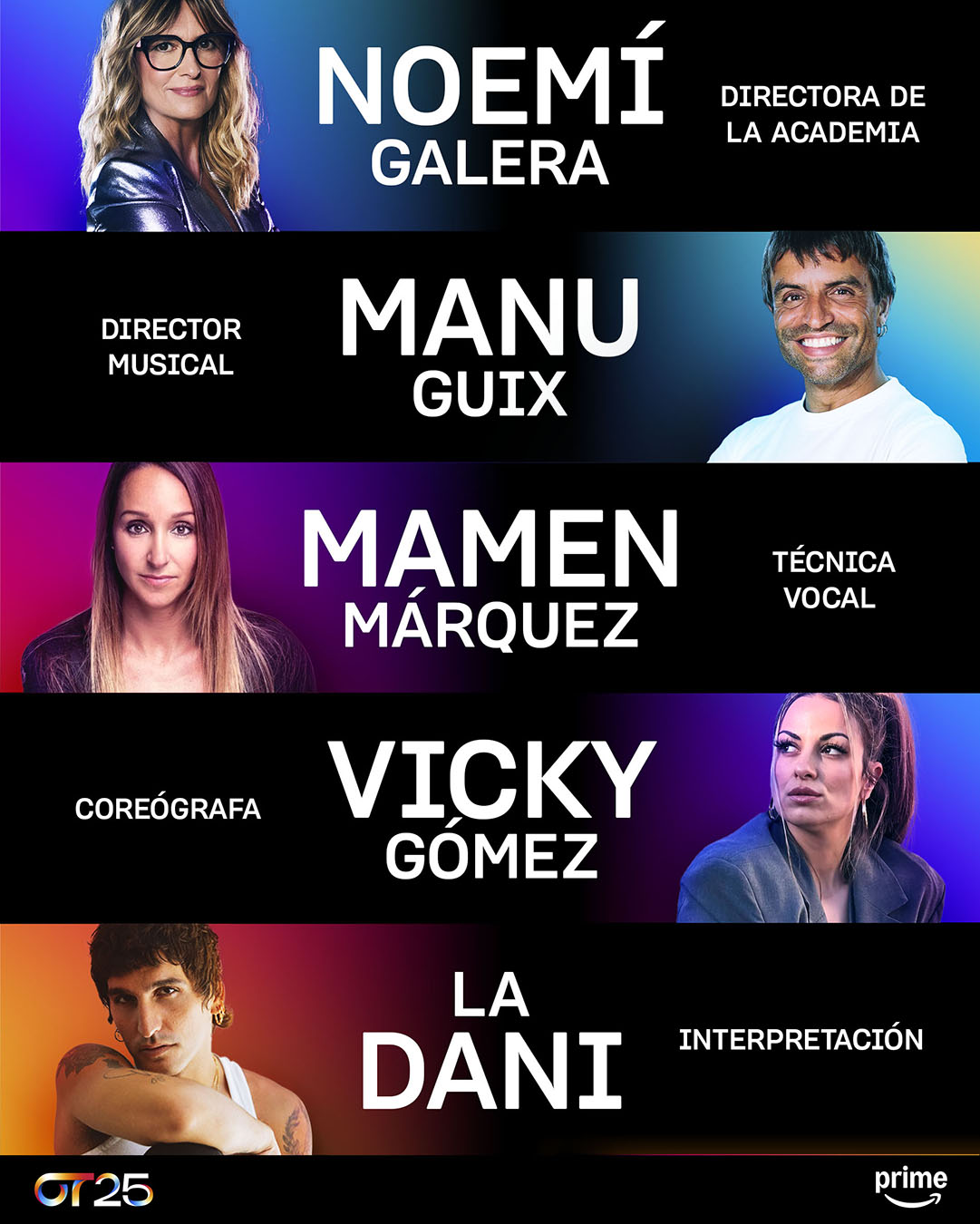 - Noemí Galera – Directora de la Academia desde 2017, forma parte del universo OT desde la primera edición, donde ha sido jurado y pieza clave del formato. Además, es directora de casting en Gestmusic, donde lleva más de 30 años descubriendo talento para los principales formatos televisivos del país.
