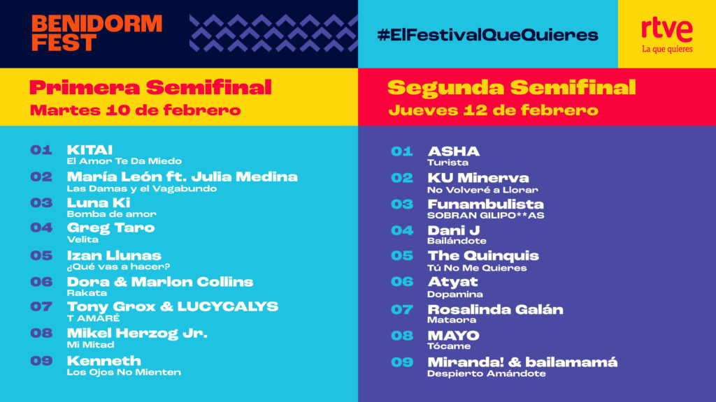 RTVE ha dado a conocer el orden de actuaciones de las semifinales del Benidorm Fest 2026, que este año cumple su quinto aniversario. Ambas galas tendrán lugar el 10 y 12 de febrero en el Palau d’Esports l’Illa de Benidorm. En cada gala se clasificarán seis artistas para la gran final del sábado 14 de febrero.